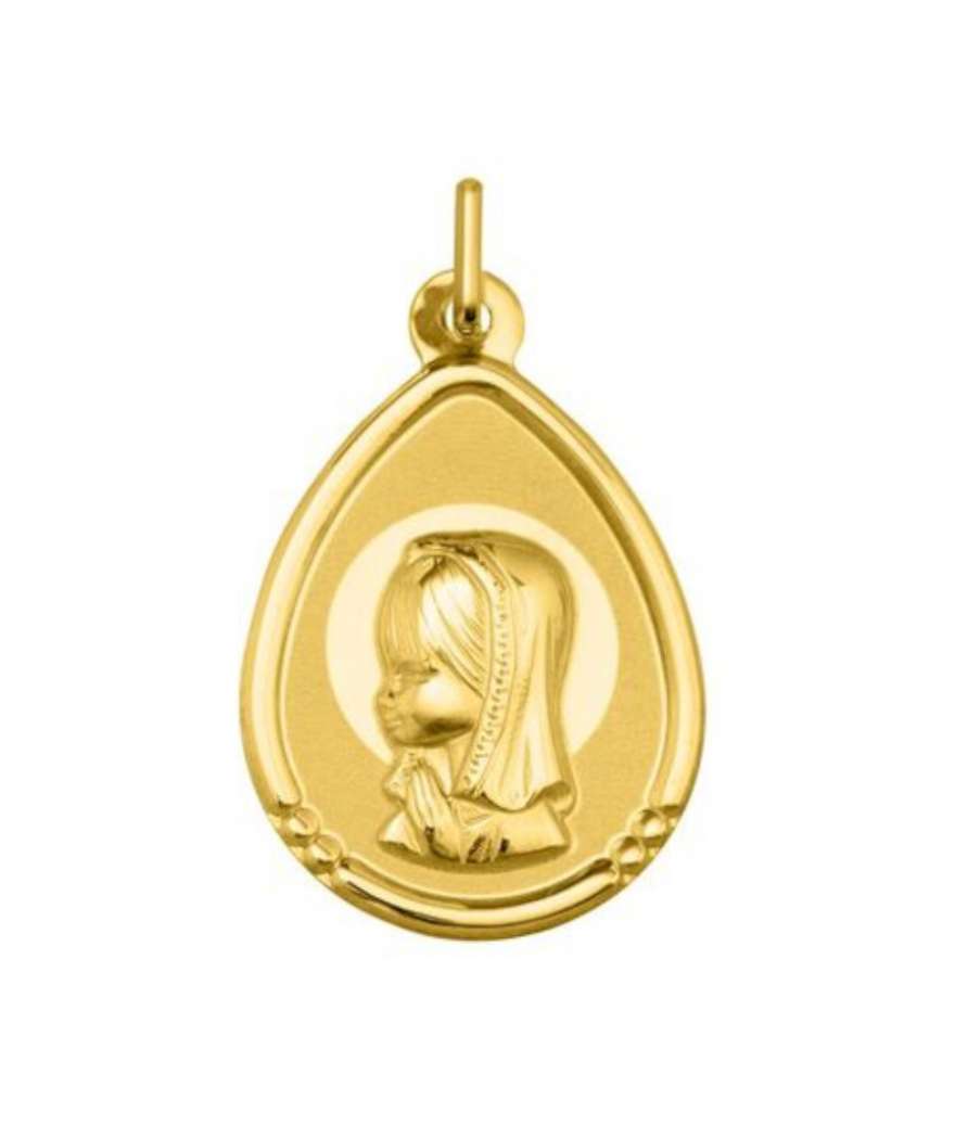 Preciosa medalla de oro con la imagen de una niña rezando, perfecta para regalo de primera comunión o bautizo. Diseño elegante con acabado pulido y detalles en relieve.