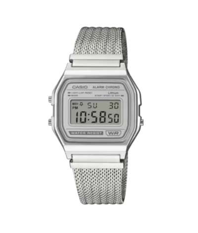 El Casio A158WEM-7AEF toma la estética clásica de los modelos A158 de Casio y la actualiza con una correa milanesa metálica de malla fina que aporta un toque elegante y versátil a este reloj digital unisex.