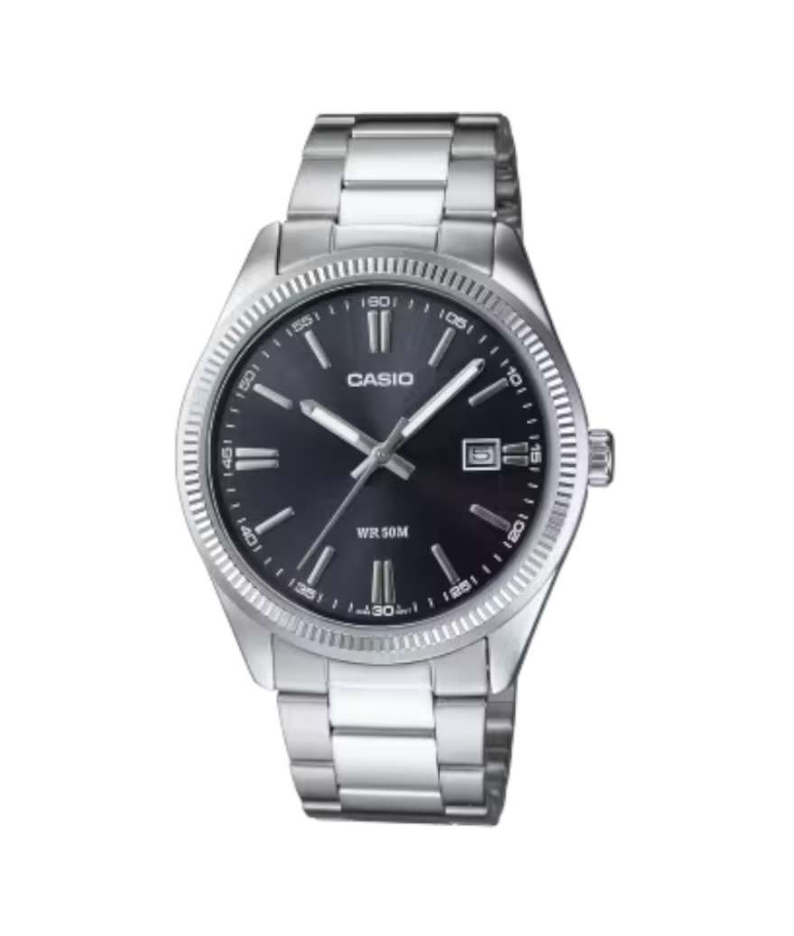 Reloj Casio MTP-1302PD-1A1VEF clásico y elegante con esfera negra, movimiento de cuarzo analógico, calendario de fecha y correa de acero inoxidable. Diseño versátil ideal para uso diario y formal.