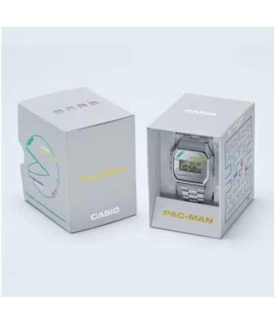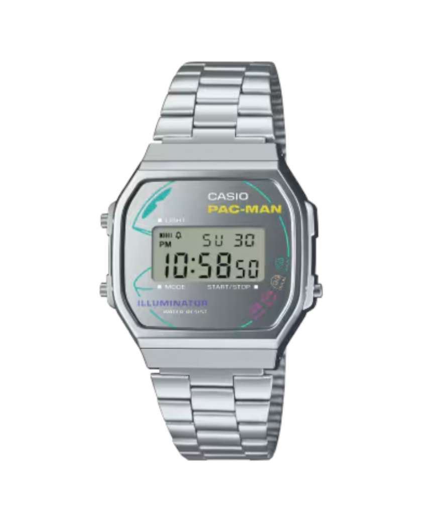 Reloj digital edición especial Casio × PAC‑MAN en acero plateado, esfera compacta y diseño retro-vintage con cronómetro, luz LED y correa metálica.
