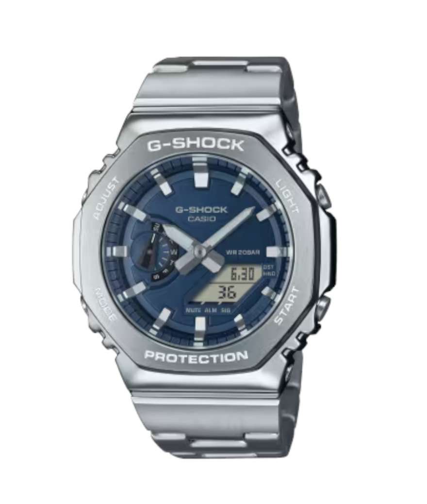 Reloj Casio G-Shock GM-2110D-2BER, analógico-digital con diseño robusto y moderno, bisel octogonal de acero inoxidable y correa metálica. Combina resistencia a golpes con funciones útiles como cronómetro, alarma y resistencia al agua 20 ATM.
