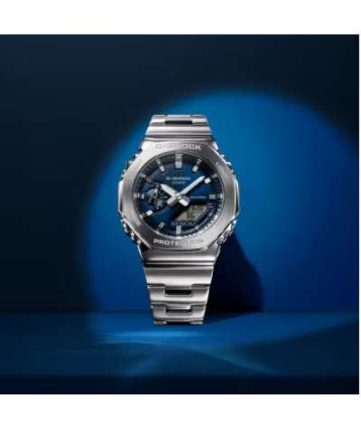 El Casio G-Shock GM-2110D-2BER forma parte de la colección G-Steel, inspirada en la popular serie GA-2100 pero con acabado metálico completo. Su bisel octogonal pulido y banda de acero inoxidable aportan un look elegante y resistente que encaja en el día a día y en ambientes informales o urbanos.