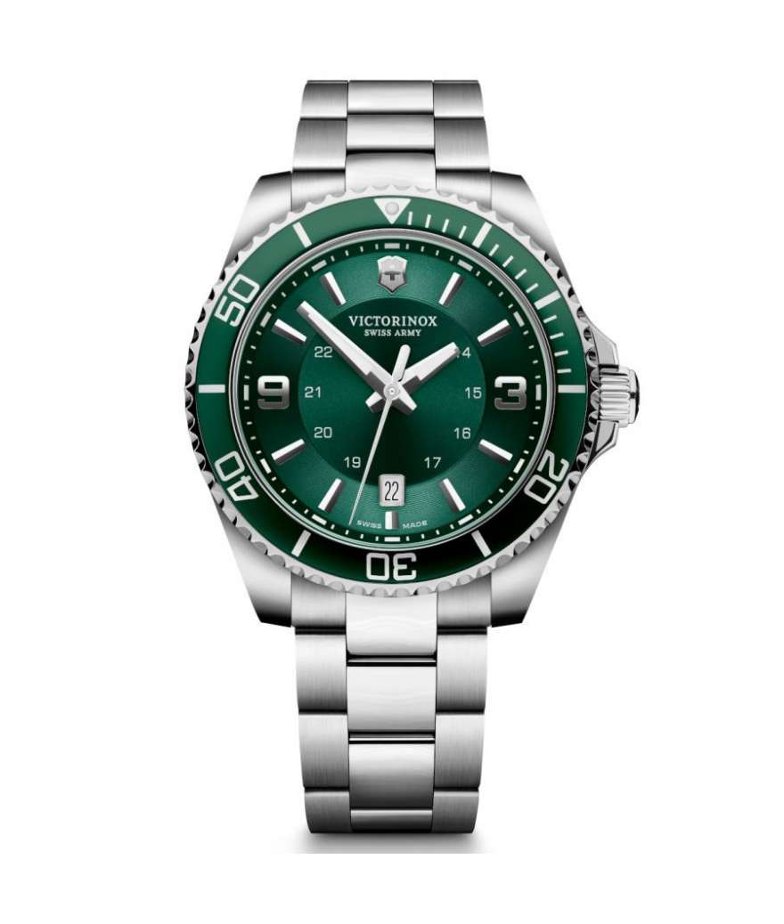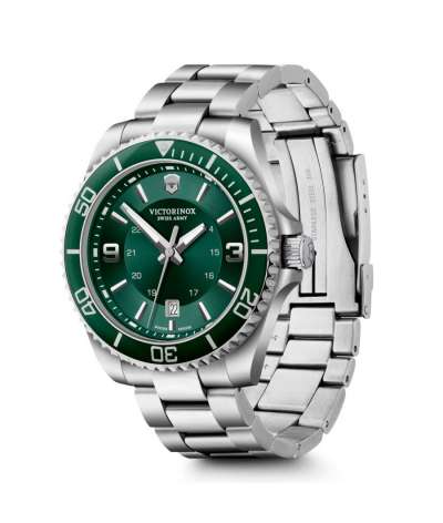 Reloj Victorinox Maverick 241394 para hombre, diseño suizo con caja de acero inoxidable 43 mm, bisel verde giratorio y cristal de zafiro. Elegante, resistente al agua hasta 100 m y perfecto para uso diario o deportivo.